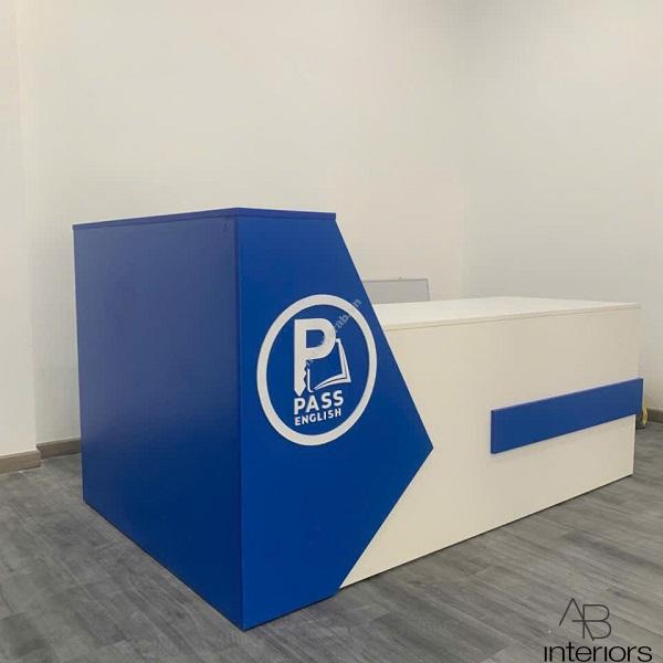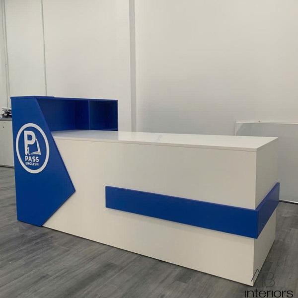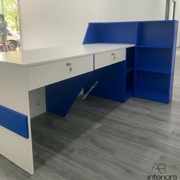Quầy lễ tân chữ L xanh trắng có LOGO QLT083