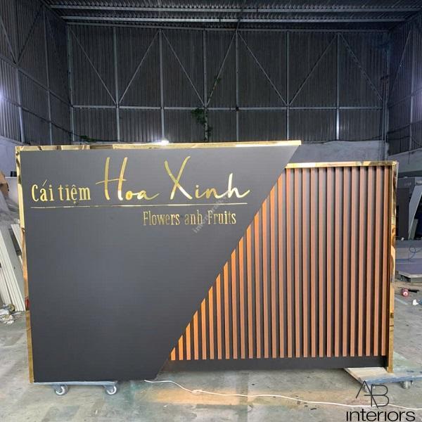 - Thiết kế: Quầy mang phong cách sang trọng, hiện đại, phù hợp cho tiệm hoa, boutique hoặc cửa hàng trưng bày; nổi bật với hệ lam sóng kết hợp hiệu ứng đèn LED tạo điểm nhấn bắt mắt.