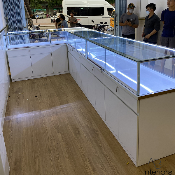 - Thiết kế chữ L tối ưu không gian: Với hình dáng chữ L, tủ giúp tối ưu hóa không gian trưng bày, đồng thời tạo ra một không gian mở rộng để trưng bày nhiều loại trang sức. Thiết kế này phù hợp với các không gian cửa hàng hoặc showroom có diện tích hạn chế nhưng vẫn đảm bảo đủ không gian trưng bày hiệu quả.