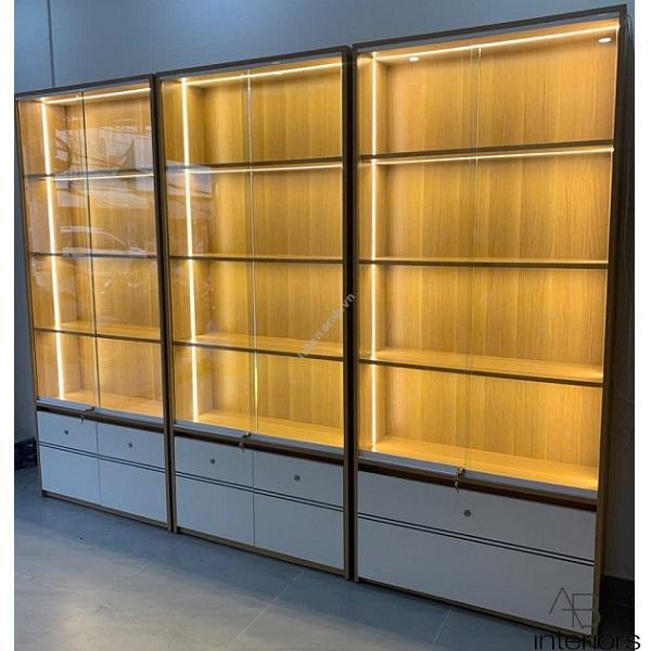 - Chất liệu: Gỗ MDF chống ẩm, đèn LED 12V, kính cường lực